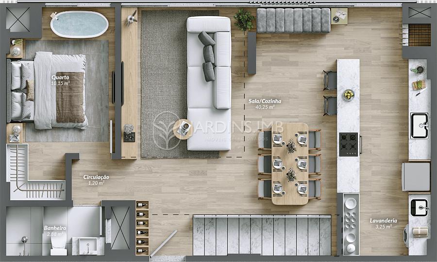 - Piso laminado na sala, dormitórios e circulações - Porcelanato nas áreas frias
