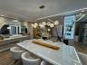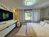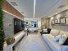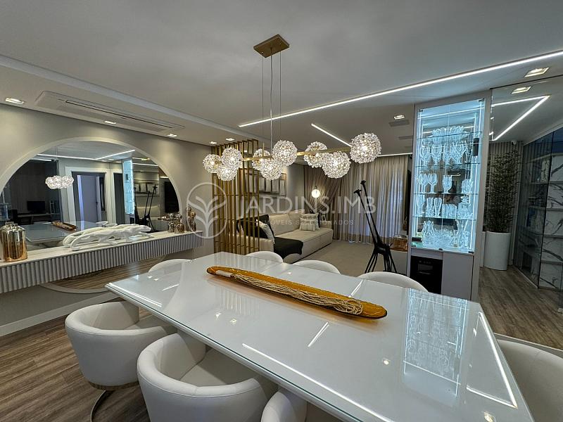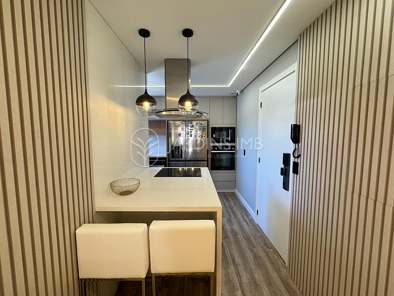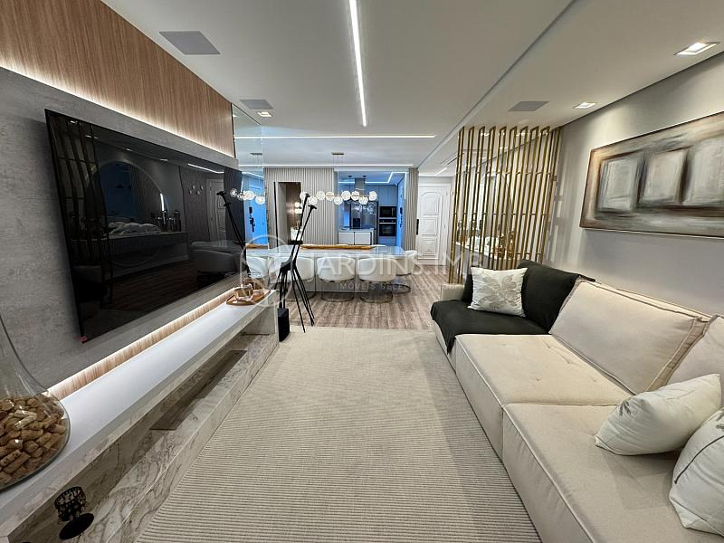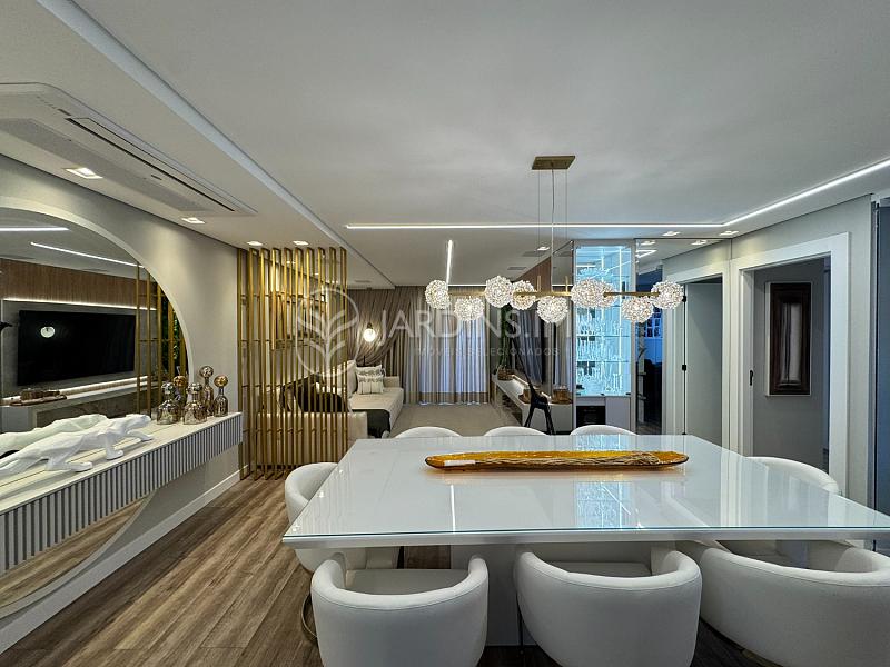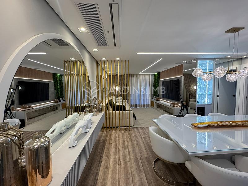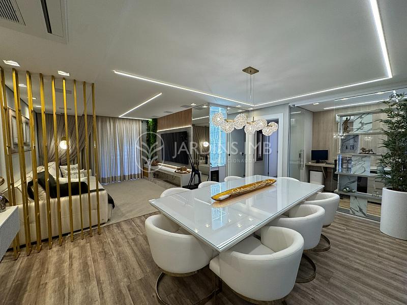 Apartamento contemporâneo, com sala de estar, sala de jantar e cozinha integrados.