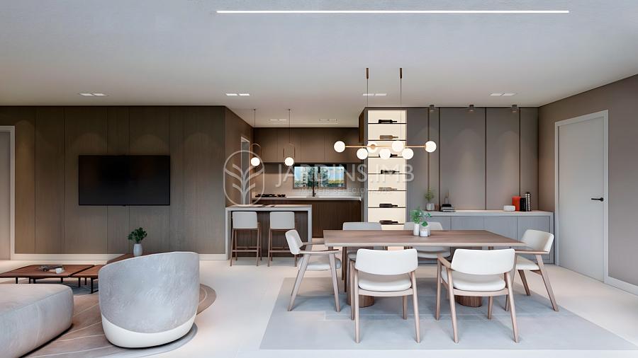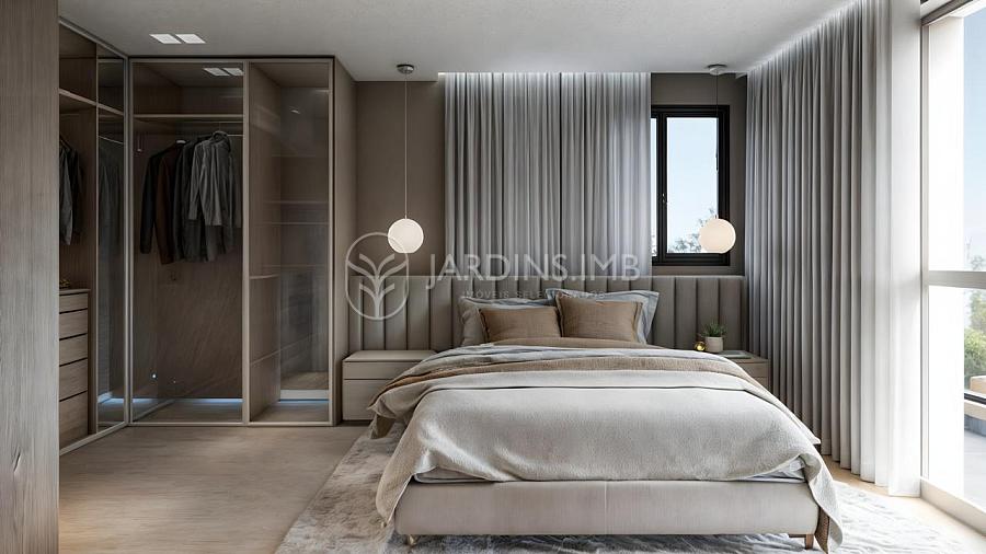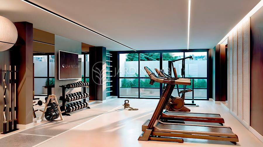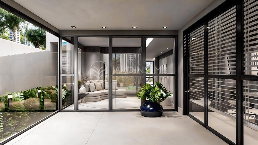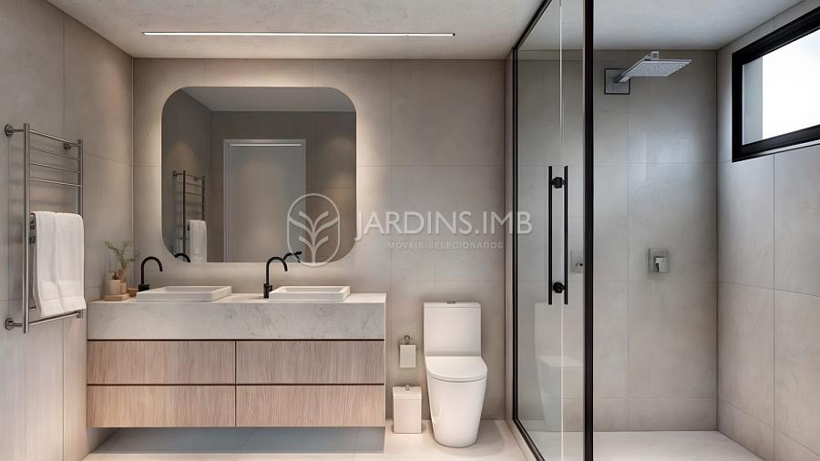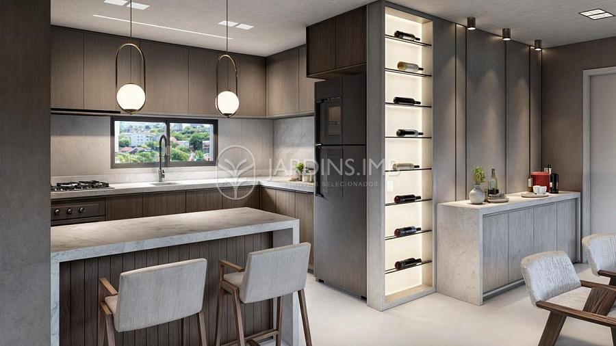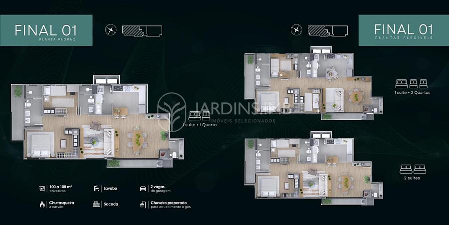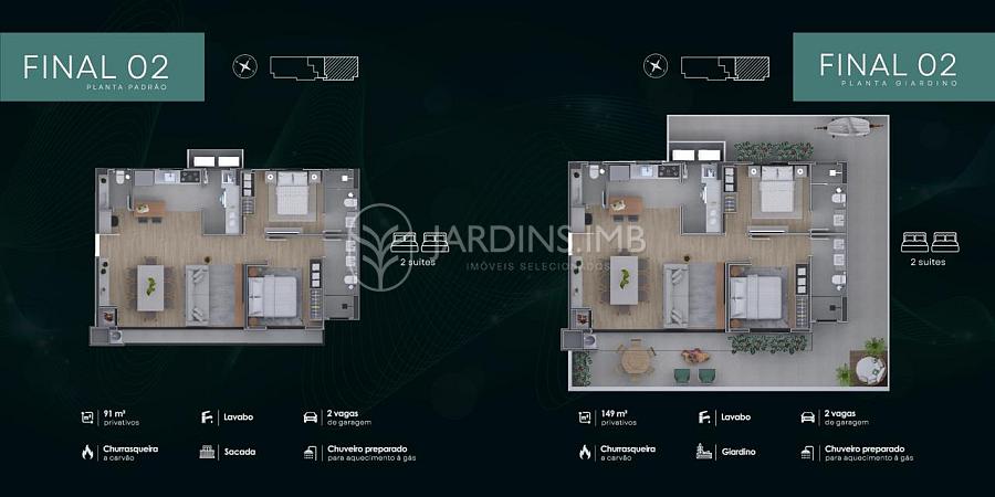 Todos com 2 vagas de garagem, churrasqueira a carvão integrada à sala, lavanderia separada, piso porcelanato e laminado, fechadura eletrônica, persiana externa com preparação para automação, aquecimento a gás.