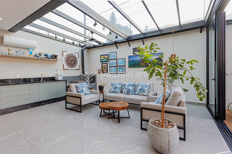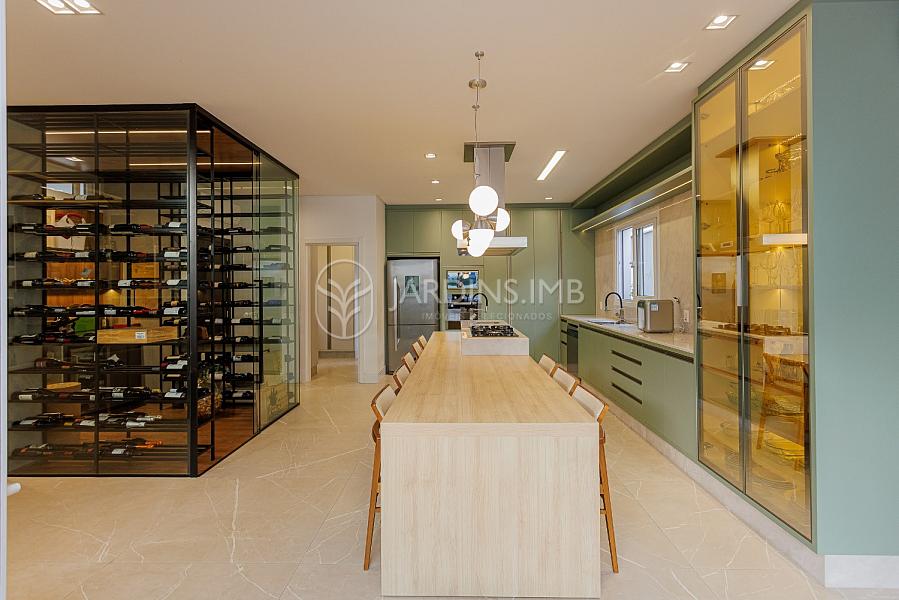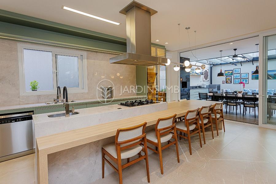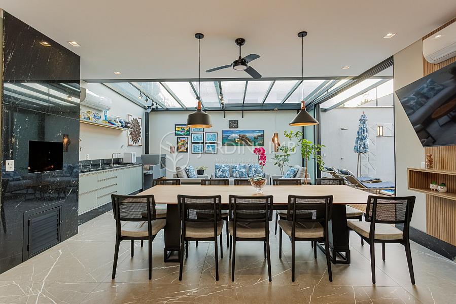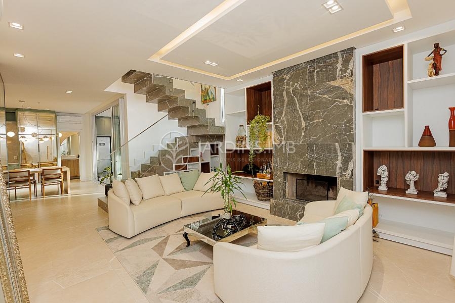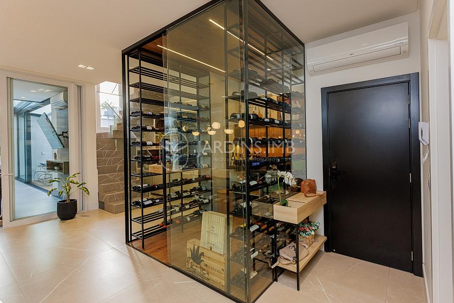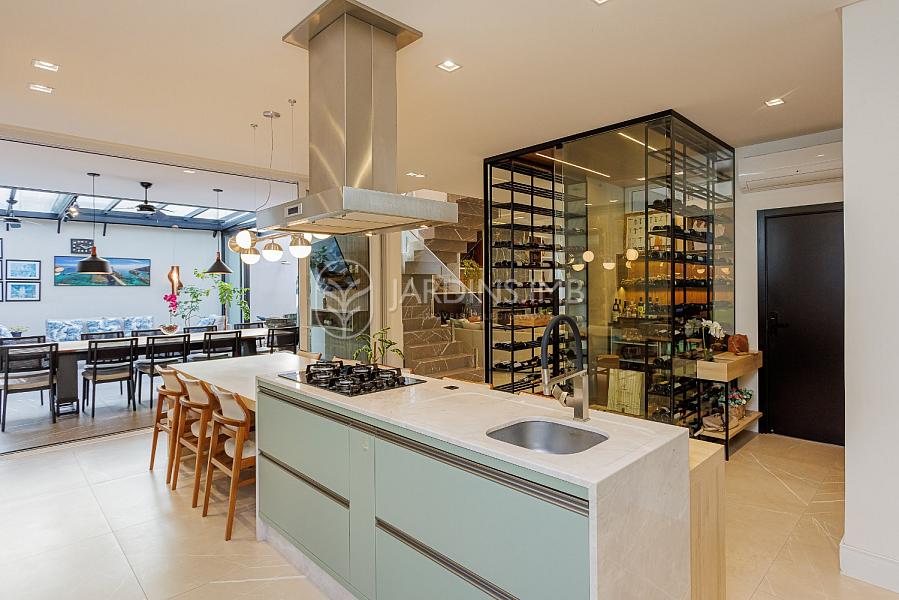 São 300m² de muito conforto e requinte. Sala de estar com lareira, cozinha integrada com área gourmet e uma linda adega. A área gourmet possui churrasqueira a carvão, fogão a lenha e teto retrátil, além de uma piscina para os dias quentes de verão.