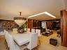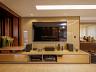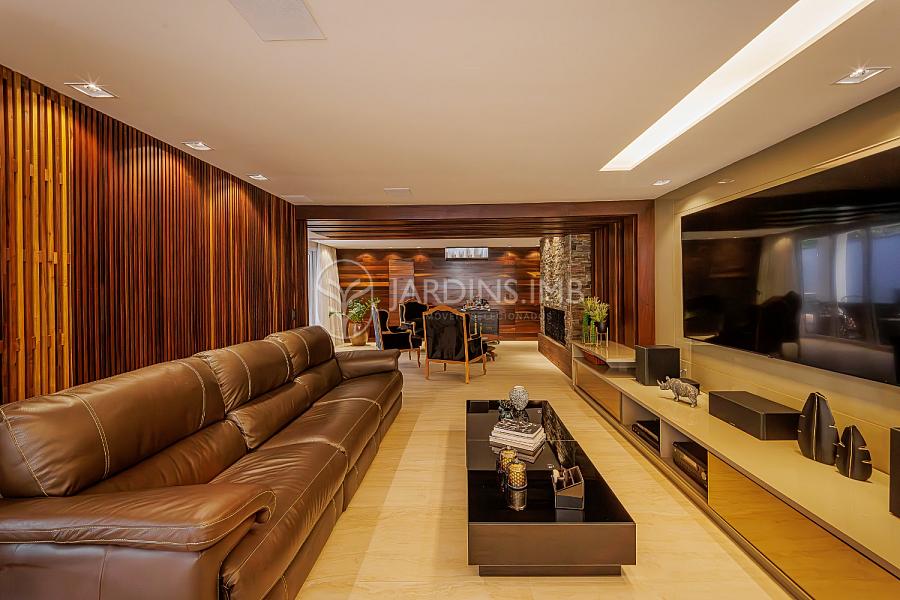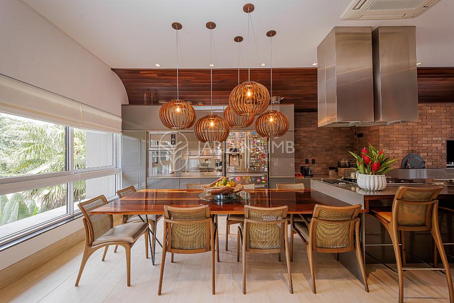 Um living integrado que valoriza os materias nobres como a madeira natural, com lareira para aquecer os dias mais frios.
