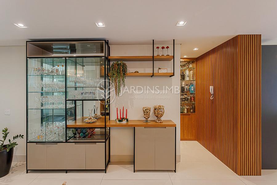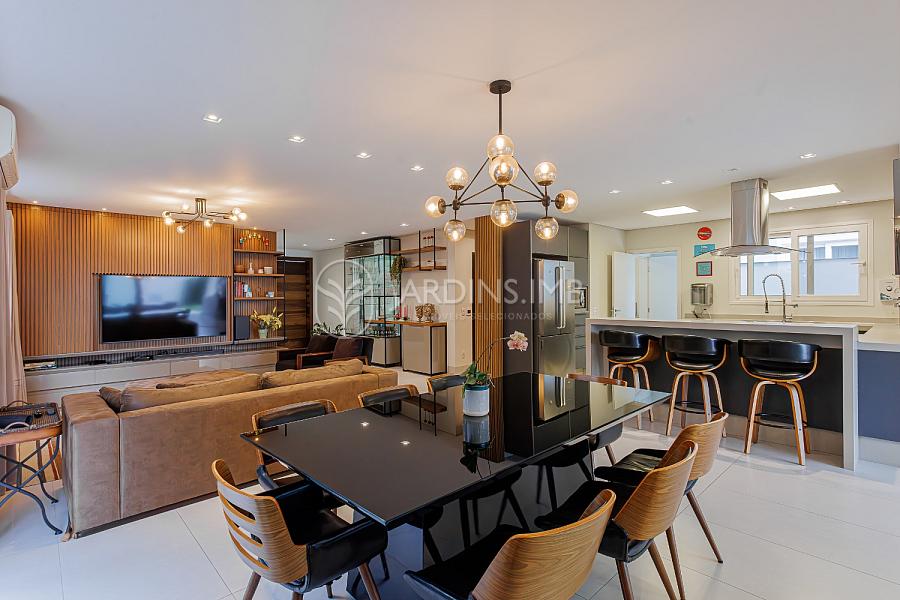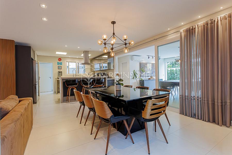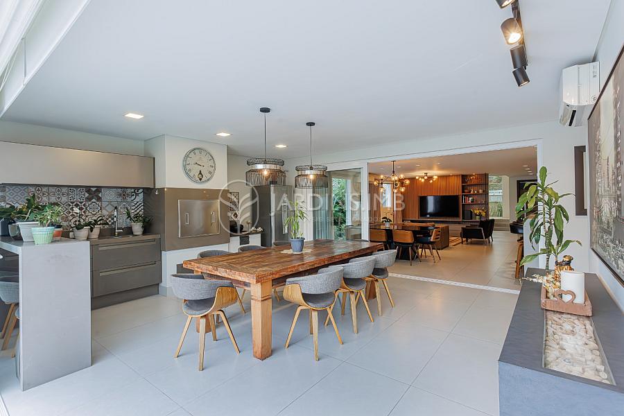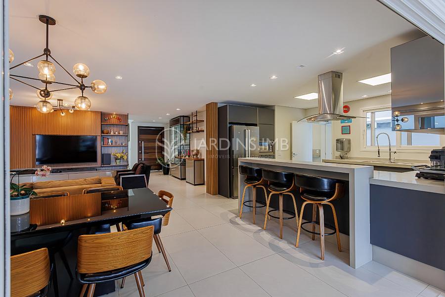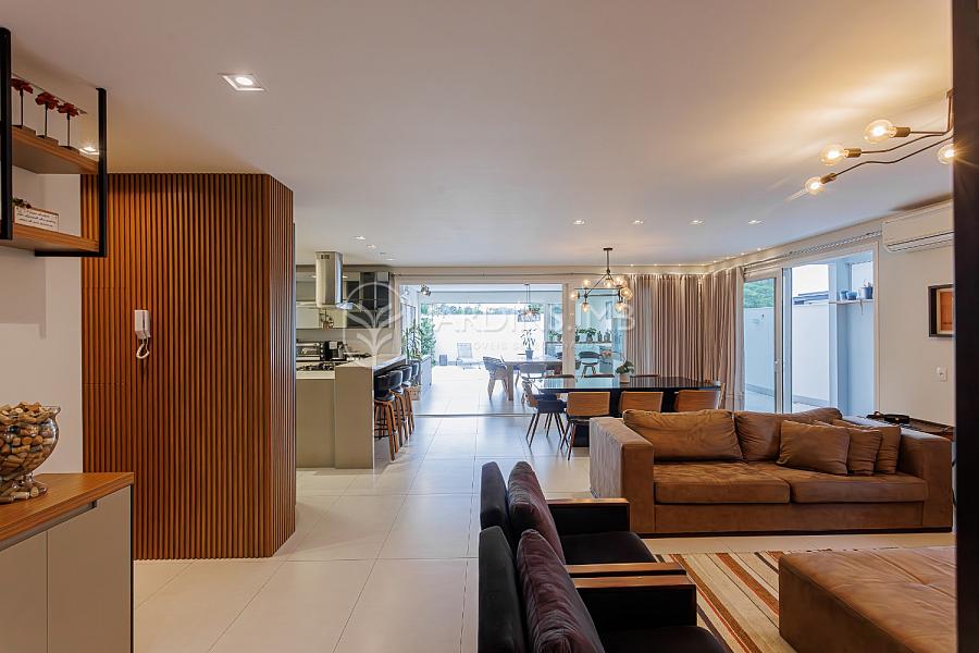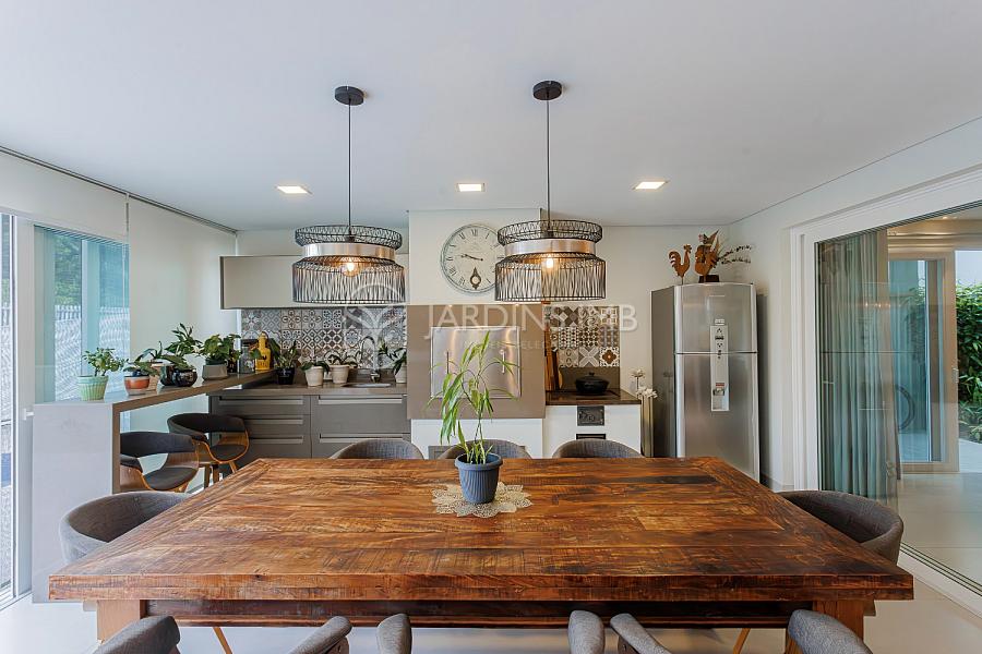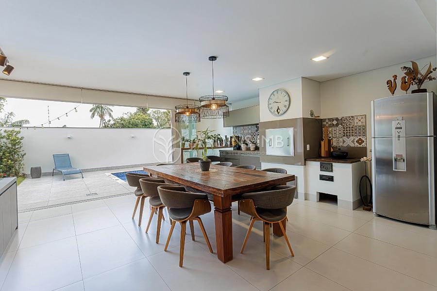 São 332m² de área privativa, com hall de entrada com pé direito duplo, living amplo com ambientes integrados, espaço gourmet com churrasqueira e fogão à lenha, adega climatizada, brinquedoteca, piscina, jardim e área de serviço com banheiro.
