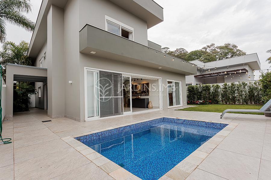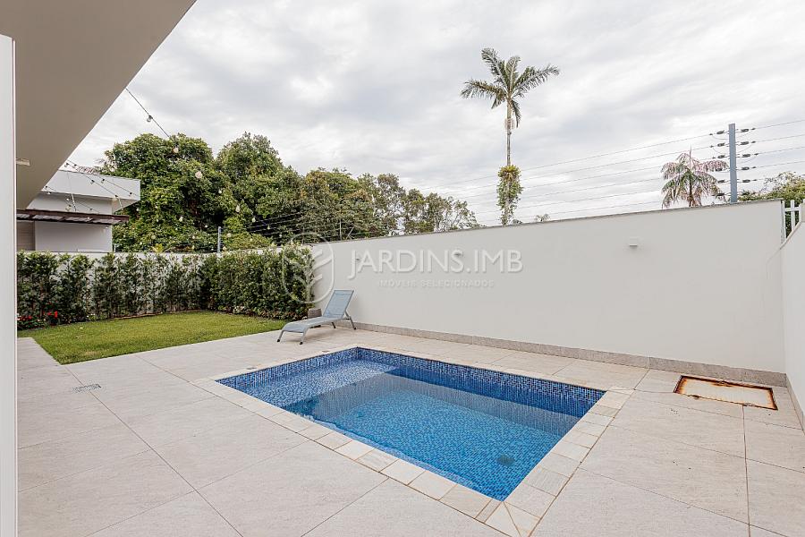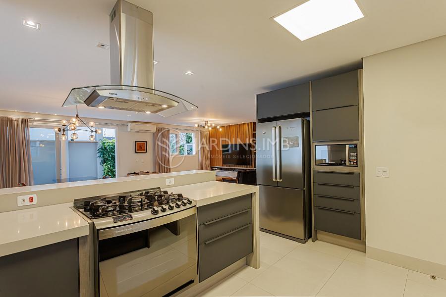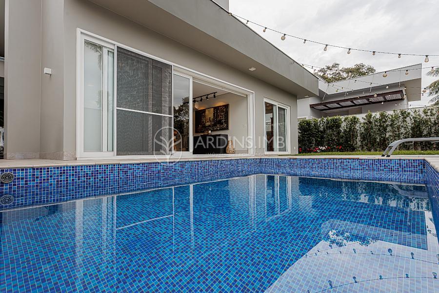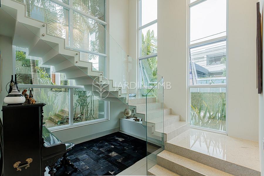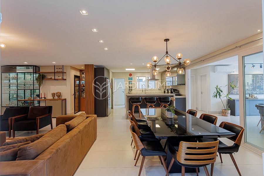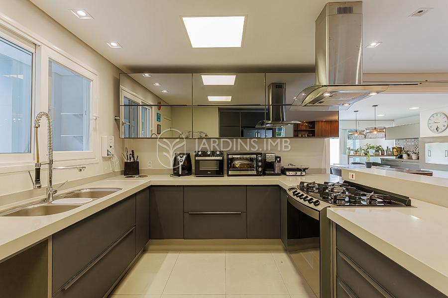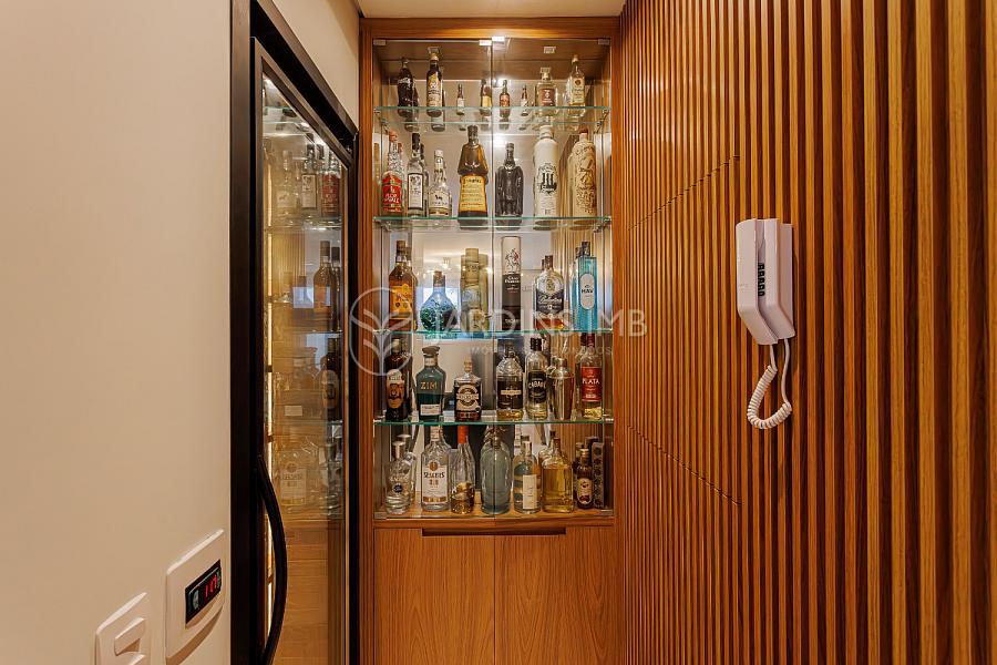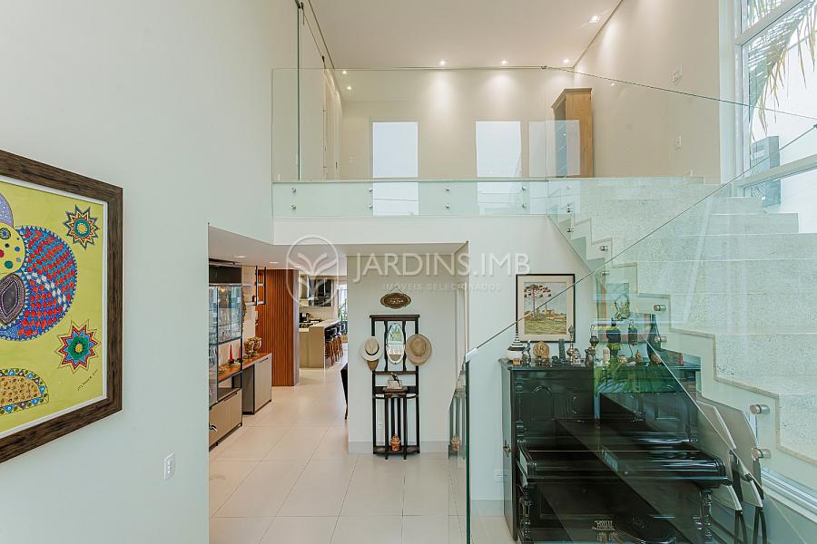 São 332m² de área privativa, com hall de entrada com pé direito duplo, living amplo com ambientes integrados, espaço gourmet com churrasqueira e fogão à lenha, adega climatizada, brinquedoteca, piscina, jardim e área de serviço com banheiro.