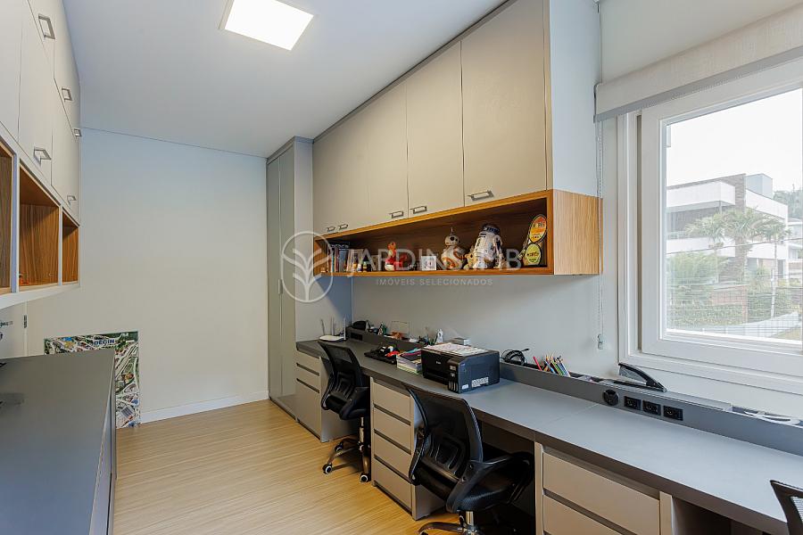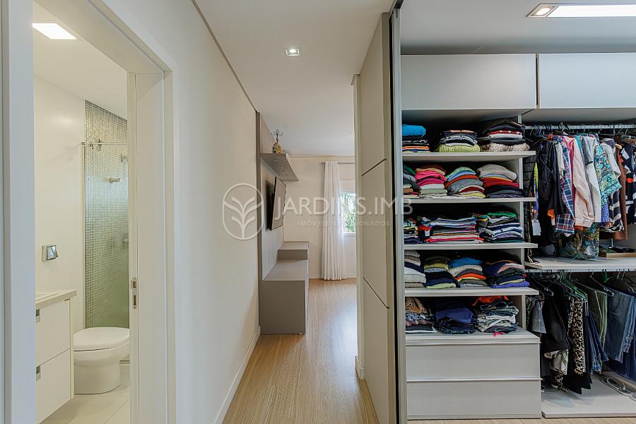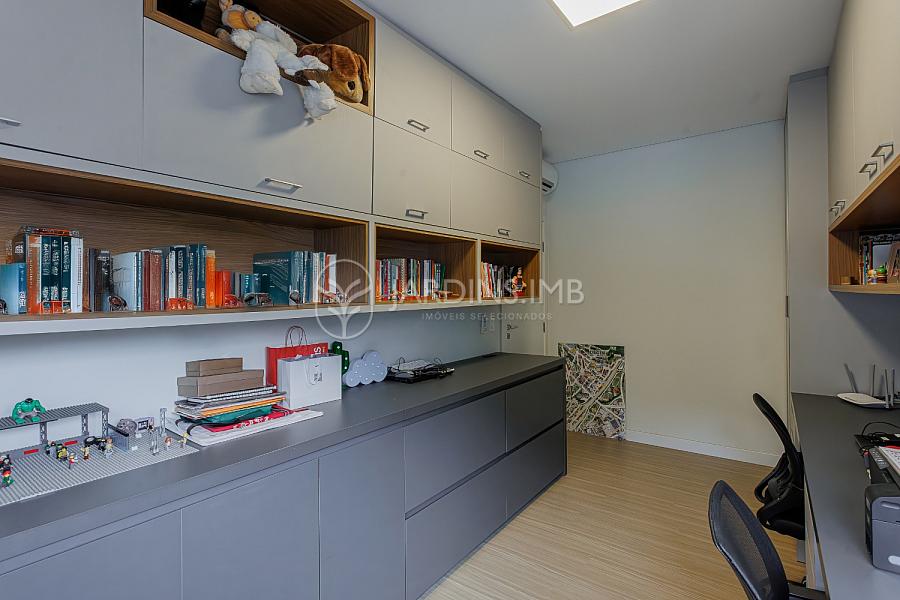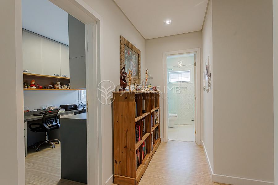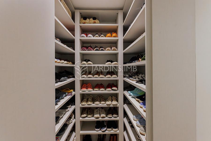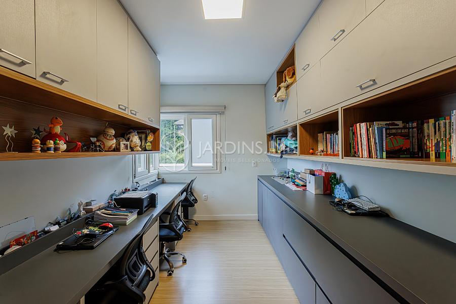 Na parte superior, são 3 suítes (1 com closet), 1 dormitório, escritório com espaço de trabalho para 3 pesssoas, rouparia e sapateira sob medida.