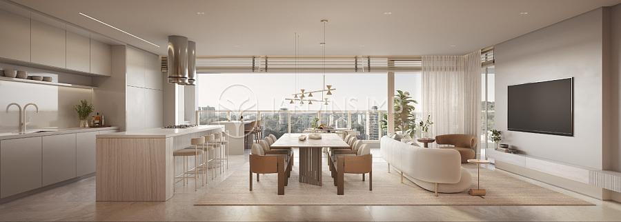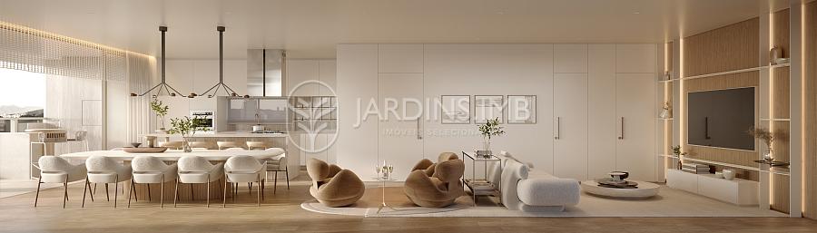 Plantas que vão de 205m² a 652m², com 3 ou 4 suítes, lavabo, sacada com  churrasqueria, automação em todo o apartamento, altíssimo padrão de acabamento e 3 ou 4 vagas de garagem.